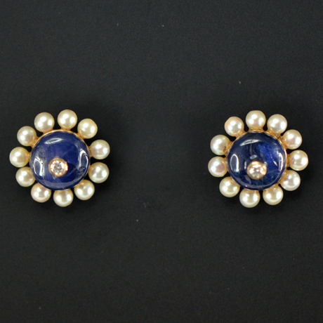 Cabochon Blue Sapphire with PEarl with Fine Diamond in the centre in 18K yeloow Gold Earstud.