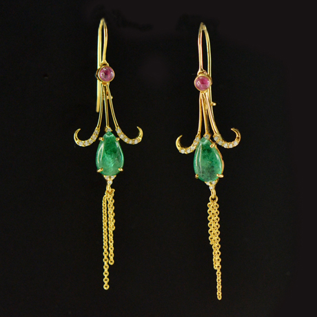 Fine Diamond, Natural Uncut Emerald and Ruby in 18K Yellow gold Hanging Earstud.