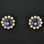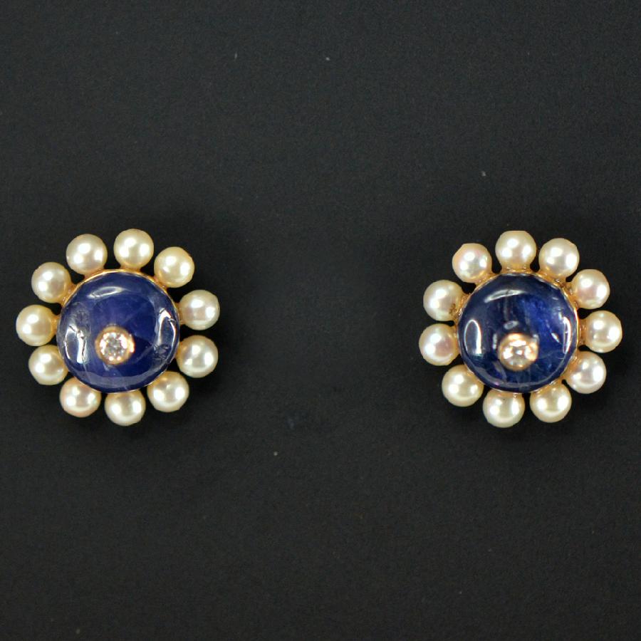 Cabochon Blue Sapphire with PEarl with Fine Diamond in the centre in 18K yeloow Gold Earstud.