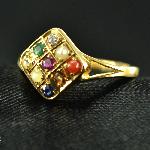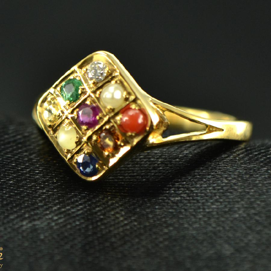 Fine Diamond with Natural Navratna studded in 18K Yellow Gold Traditional Ring.