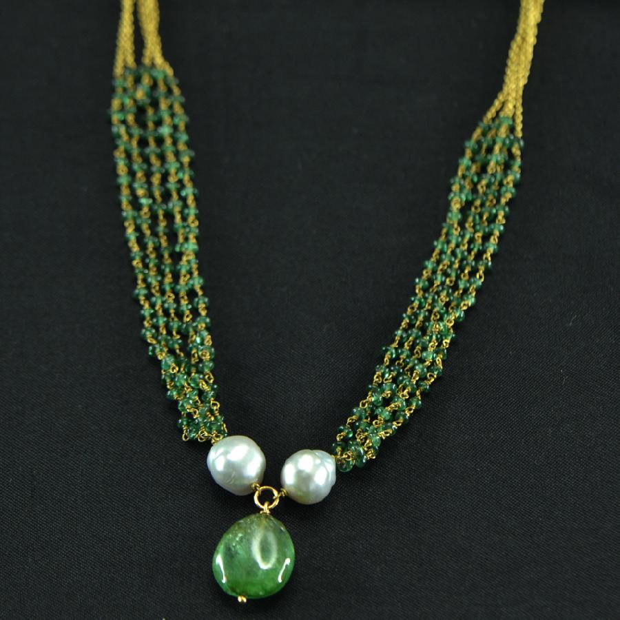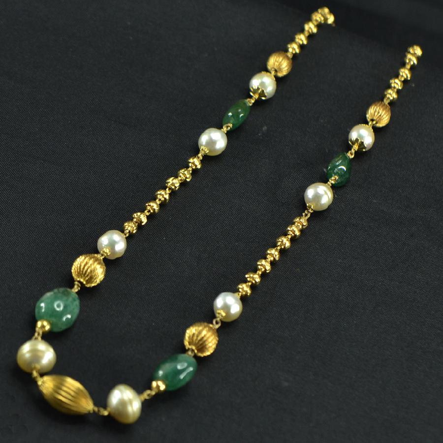 Cabochon Tumbled and small Faceted Emerlad Beads with Akoya Pearls Knotted in 22K 22K Yellow Gold.