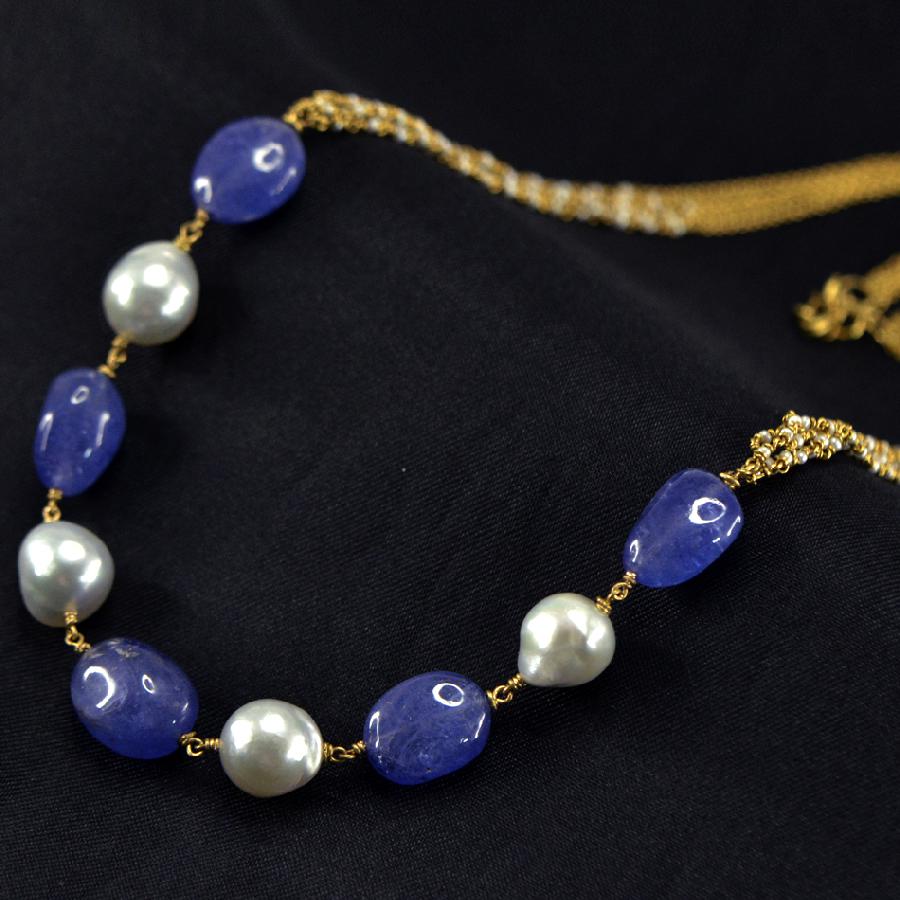 Natural Uncut Tumbled Blue Sapphire bead with Japanese Akoya Pearls Knotted in 22K Yellow Gold.