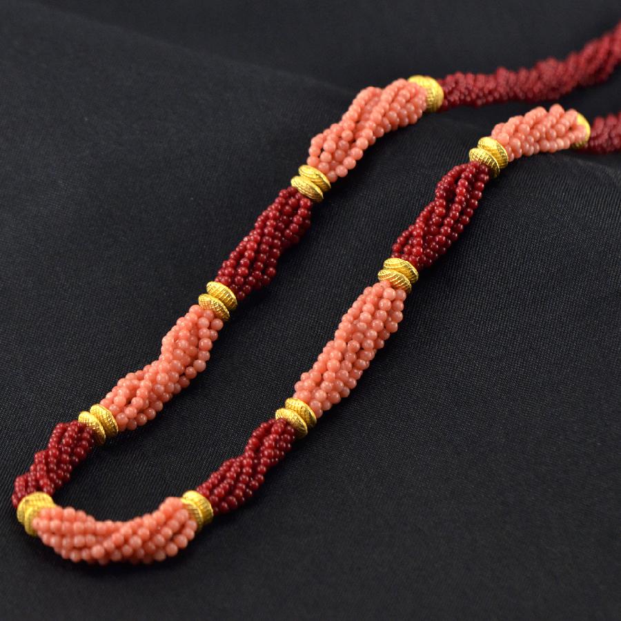 Natural Pink and Orange Coral Beads Strung with 22K yellow Gold Spacers.