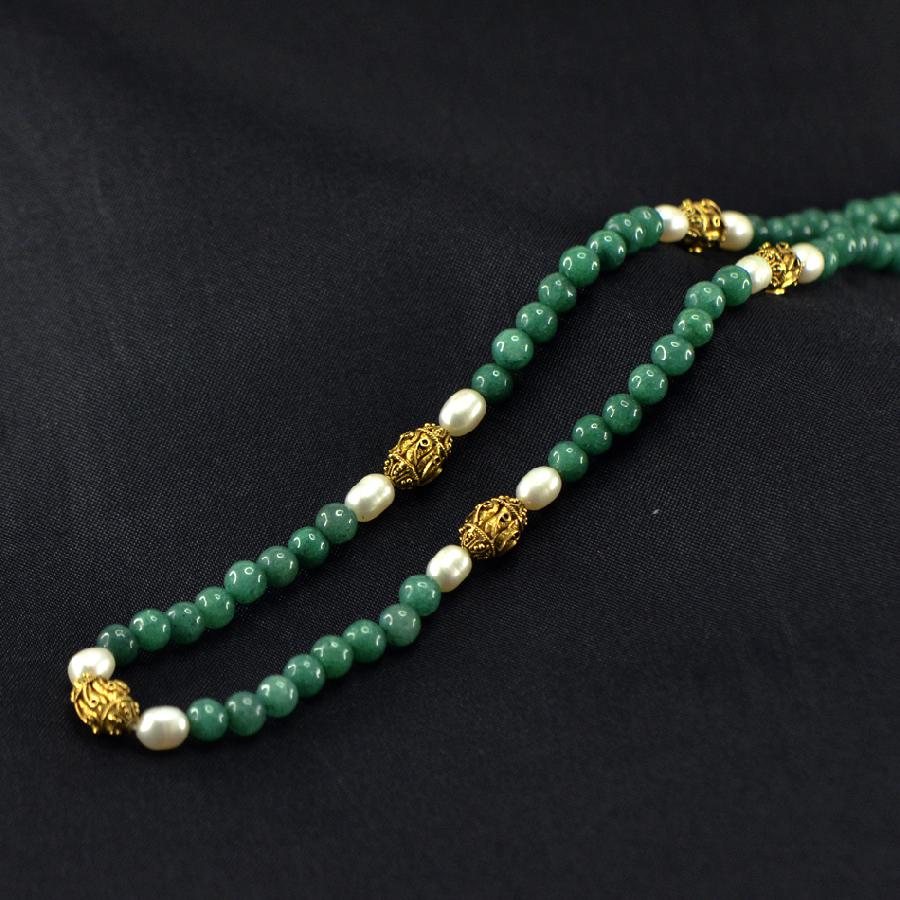 Natural Round Green Onyx and Pearl Beads Strung ith 22K Yellow Gold Spacers.