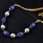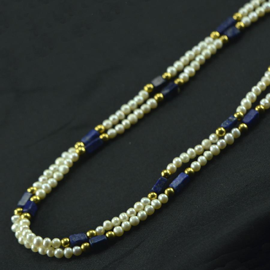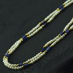Round Cultured pearl and Natural Lapis Beads Strung with 22K yellow Gold Spacer.