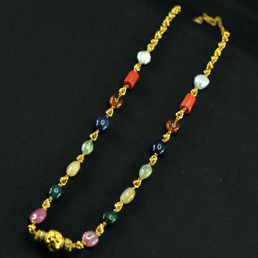 Natural Navratna Beads, Diamond Beads spacer knotted with 22K Yellow Gold Antique look Brahma Mudi spacer.