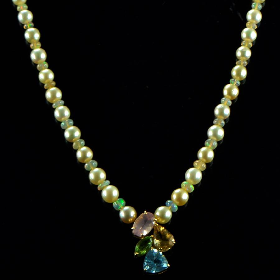 Strung with Cultured Round Pearls mala and Natural Opal Bead with Natural semi precious Gem stone pendant in 18K Yellow Gold